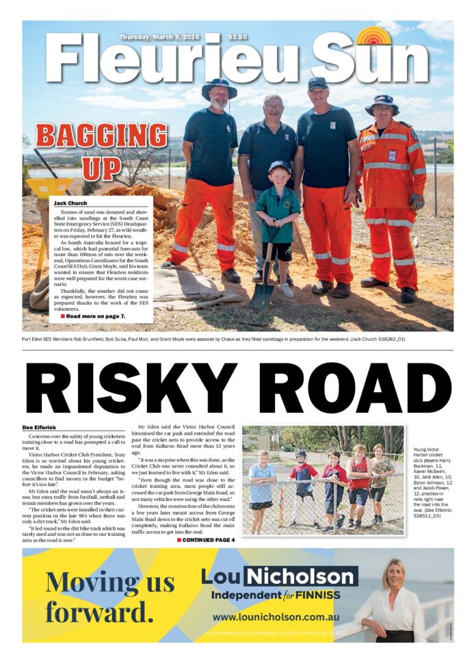 Fleurieu Sun – 5th March 2026 Subscribe or Login to see the rest of the content. Username Password * Remember Me Forgot Password News Dragons kick off Masters Games 14/04/2026 The 2026 South Australian Masters Games competition started on Saturday, April 11 at Mannum Waters Marina. Due to the inability to hold dragon boat... Suns on fire as they top the table 14/04/2026 In the final week of the Great Southern Table Tennis Association Autumn competition, Suns defeated Clouds 8–5 in rubbers and 42–28 in games in... Adare’s annual garage sale is back 14/04/2026 The awesome Adare Uniting Church garage sale, is on again this Saturday April 18. Ever popular with locals and visitors this event has something...