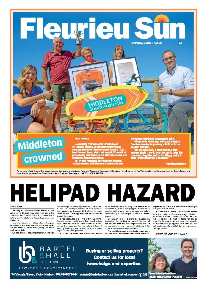 Fleurieu Sun – 7th March 2024 Subscribe or Login to see the rest of the content. Username Password * Remember Me Forgot Password News A big bowling week at Encounter Bay 11/11/2025 Melbourne Cup A game of BPL was a fantastic way to work up an appetite for our mouth-watering Melbourne Cup Lunch. The BPL champs were... Women’s Derby in Division 1 11/11/2025 Night Owls Once again, the evening was very pleasant for the enjoyment of lawn bowling. There was not as close competition this week as last... More elves needed for Christmas event 11/11/2025 A Myponga Children's Christmas event is at risk of being cancelled. A lack of volunteers to assist with the annual kids Christmas shindig, which includes...