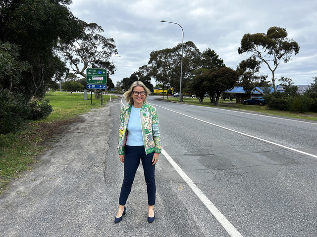 City of Victor Harbor Mayor Moira Jenkins on Armstrong Road, Victor Harbor which has received $200,000 government funding for a bicycle path between Investigator College and Armstrong Road.