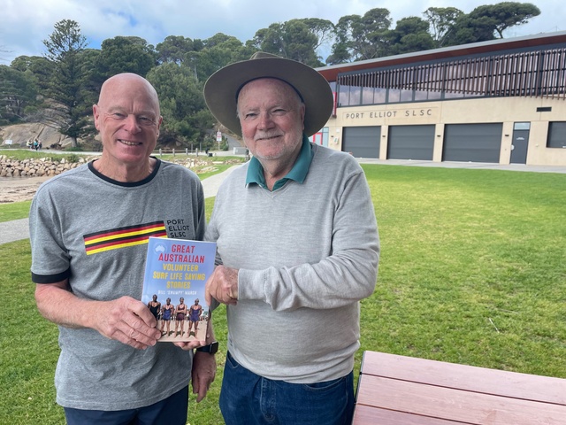 Allan Phelps who was saved at Horseshoe Bay by Port Elliot Surf Life Saving Club Nippers many years ago with Bill 'Swampy' Marsh and his new book. There is a chapter on Allan's experience in the book. (Michael Simmons 509377_01).