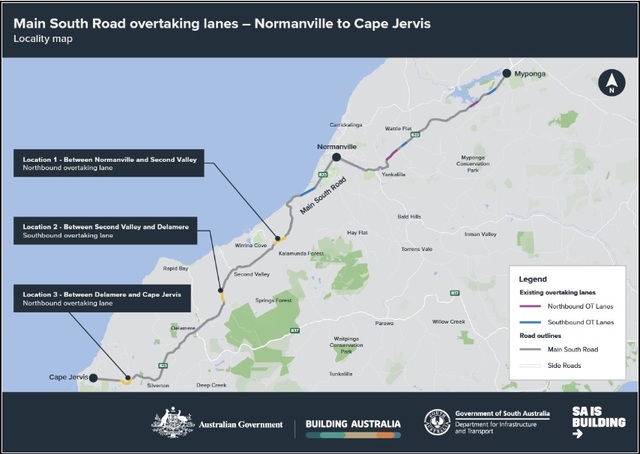 The three locations where new overtaking lanes are to be constructed from Normanville to Cape Jervis along Main South Road. (Department for Infrastructure and Transport).