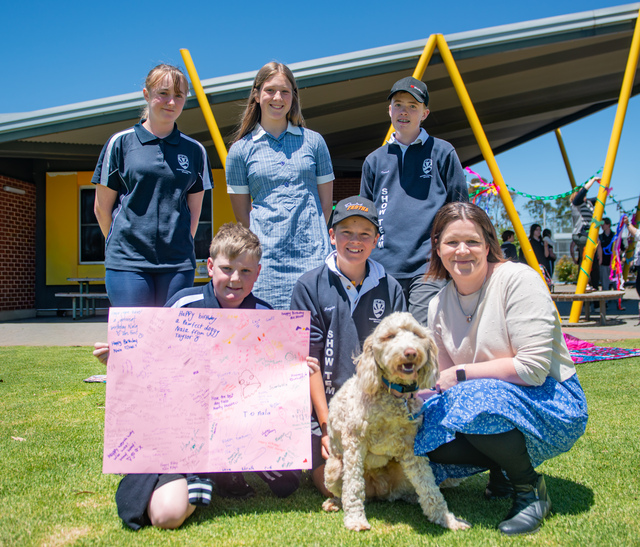 Annalise, Amy, Kody, Marlo, Hayden, Wellbeing Dog Nala and Assistant Principal for Inclusion and Wellbeing Merryn Gomez on Nala's first birthday. (Jack Church)