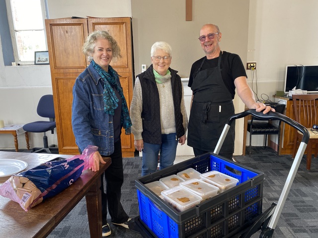 Sandy Donlan, Vicki Plummer and John Moore are assisting in providing fresh hot meals every Wednesday afternoon at the Church Pantry on Crocker Street, Goolwa.