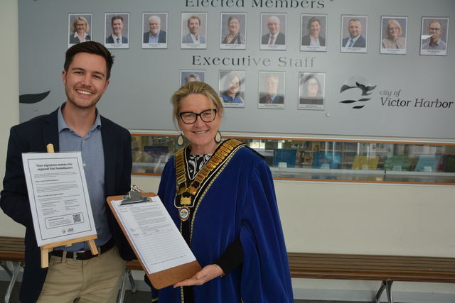 City of Victor Harbor councillor and Mayor Brayden Mann and Moira Jenkins with the petition to assist first home buyers. (Michael Simmons).