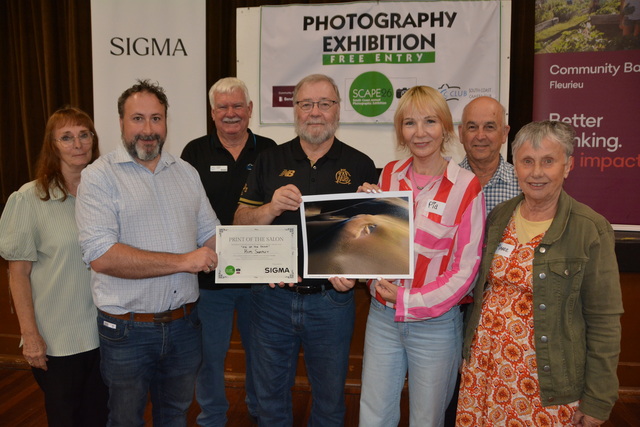 With the winning photo at Victor Harbor's National Print Salon are Julie Deer (judge), Ian Leggett (SIGMA), Grant Petras (president of the South Coast Camera Club), Keith Seidel (judge), Pia Jessen (judge and president of the Australian Photographic Society), Jeffrey Venning (judge) and Maree Morris (judge). PHOTOS: Michael Simmons).
